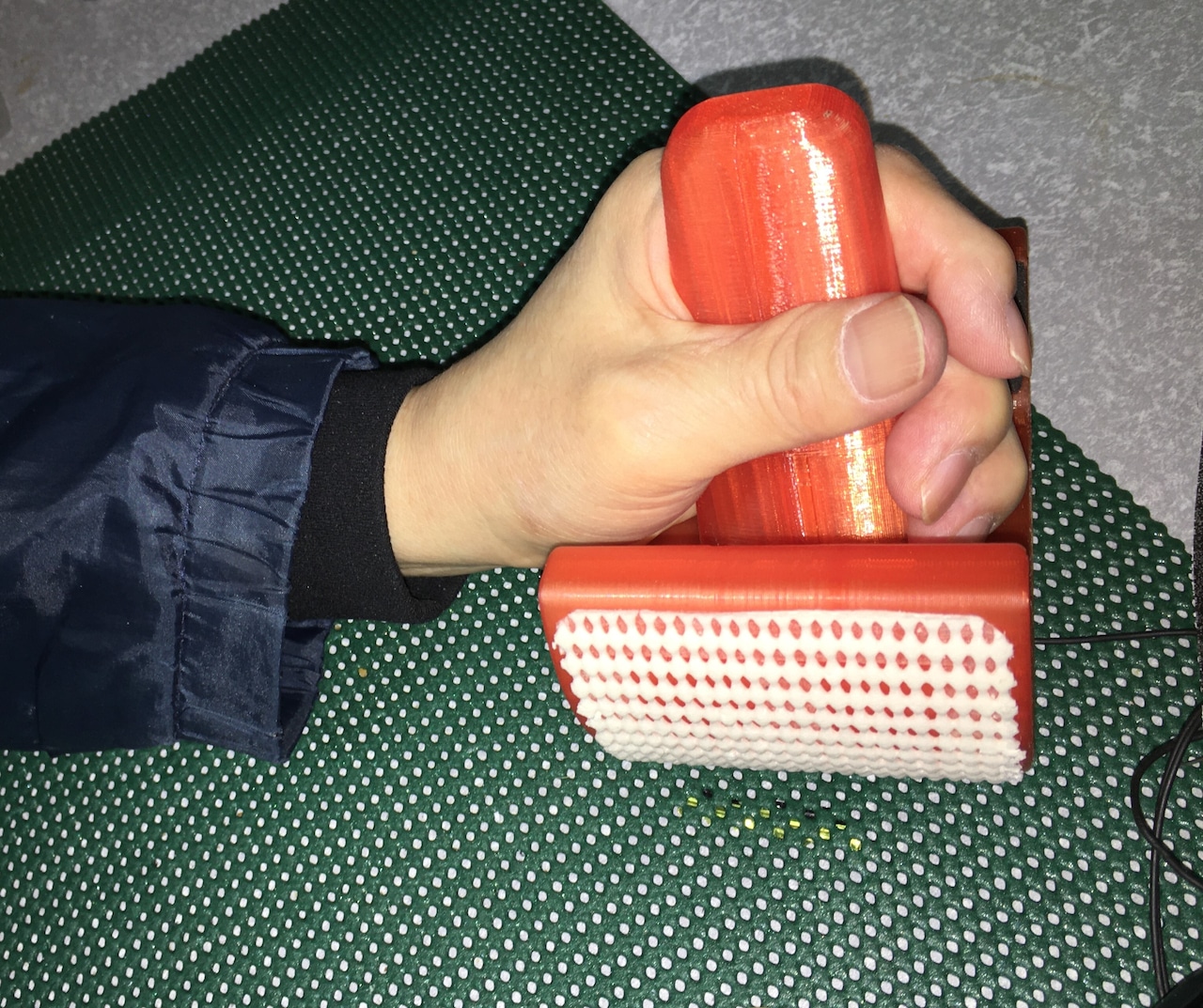 脳卒中で腕に麻痺が残った知人が作業療法士の指導の元、麻痺側の前腕のリハビリをしていました。前腕の回外回内運動を小さなボールを手で膝の上で転がす繰り返し運動です。当事者からこの運動を専用の道具でさらにやり易く、効果が出るようにしたい!という希望で共同開発しました。